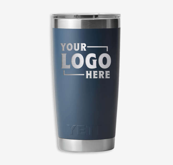 Personalized stainless steel tumbler with detailed logo engraving.